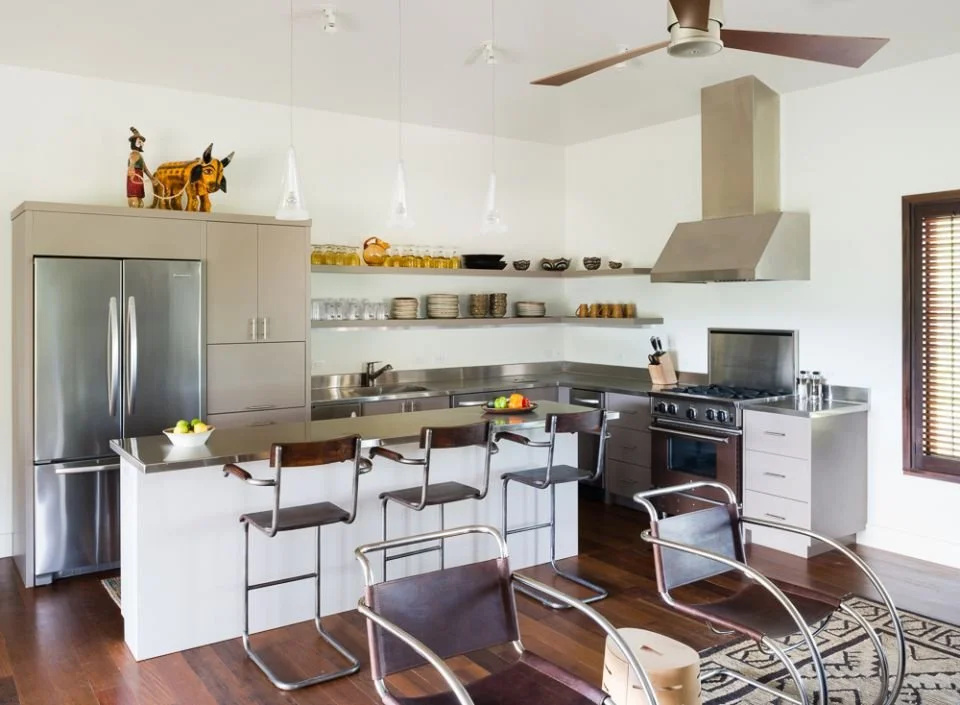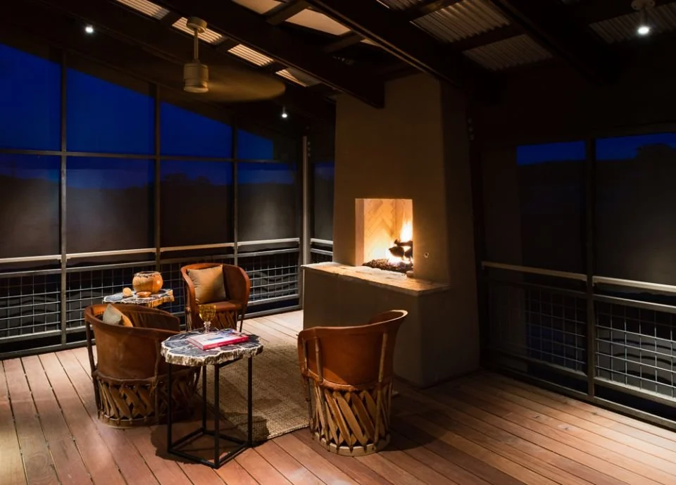 A massive chimney anchors the porch to the sloping site and is part of its structural support. All of the porch’s steel and wood structure is expressed and simply detailed like the rural hill country buildings it emulates. Folding doors in at the Living Room opens the house to southeast summer breezes. A ground level porch, paralleling communal grand children’s bunk rooms, is play space and assembly area for expeditions to the pond.