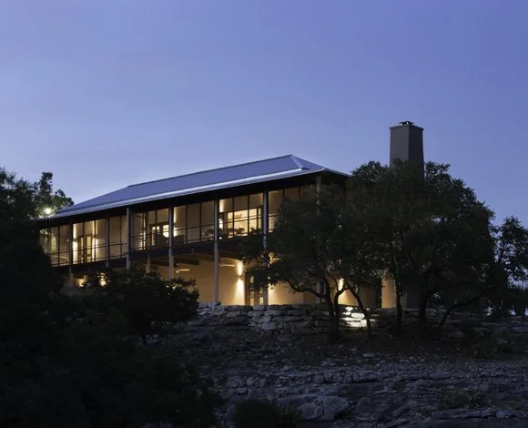 This family ranch in the heart of the the Texas Hill Country is a cherished family retreat. This bunkhouse is linked to an existing one bedroom guest house by a courtyard paved with limestone quarried from the ranch. It is carefully sited to buttress to the end of the crescent shaped ridge. A long upper level porch provides views under tree canopies toward a pond used for swimming and views to a more distant lake above the tree lines. The porch widens at its southern end to provide ample room for viewing winter sunsets in front of a fire, and as a frame for a panoramic view of the horizon.